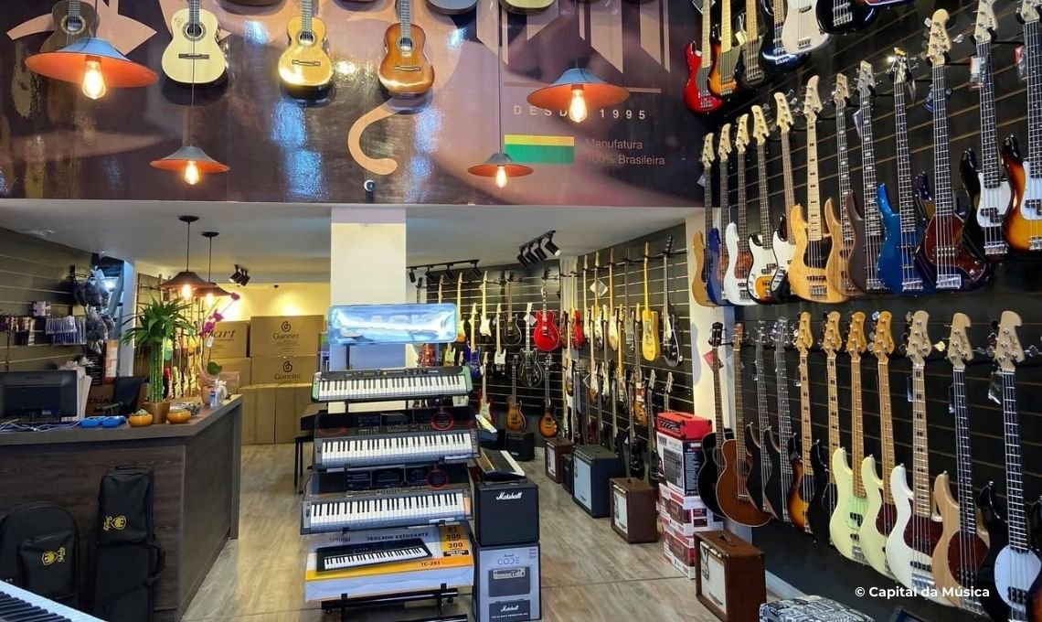 O organizado espaço vende guitarras, violões, baixos, baterias, pianos, teclados, amplificadores de diversas marcas, além de acessórios, como cabos e cordas.
